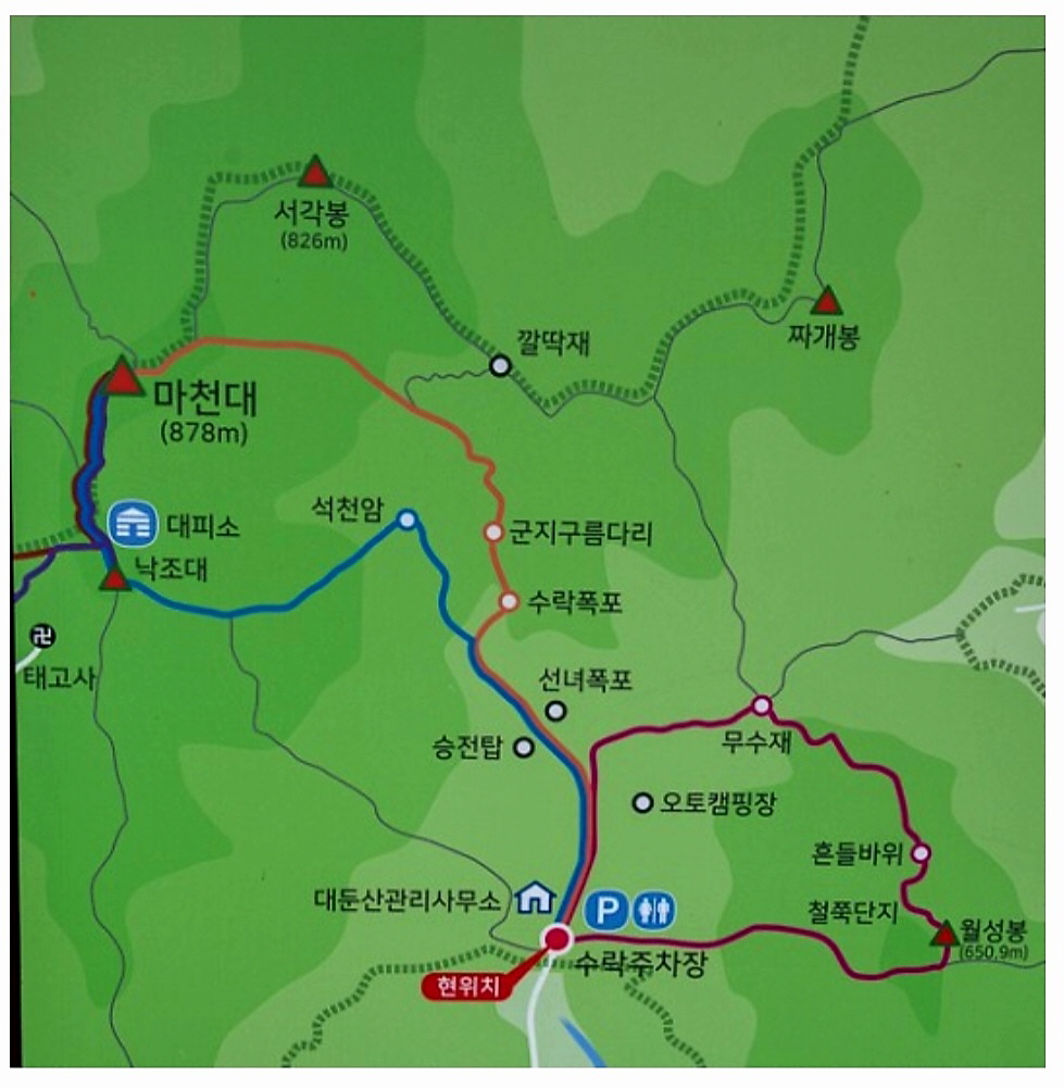 수락주차장~승전탑~수락폭포~220계단~군지구름다리~마천대~낙조대산장~수락폭포~수락주차장